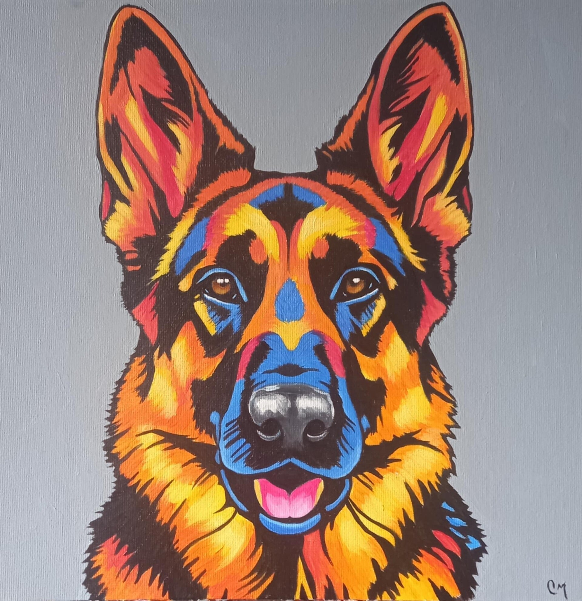This 12 x 12 inch acrylic painting depicts an Alsatian in vibrant, bright colors. The bold palette highlights the dog’s strength and intelligence while giving the portrait a lively, modern energy.On canvas board.