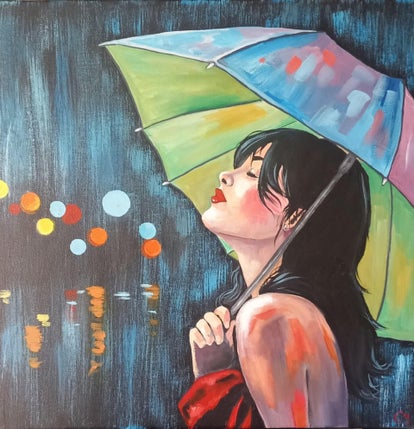 This is a 16 x16 acrylic painting of a girl taking a calming moment in the rain. It is done on stretched canvas.