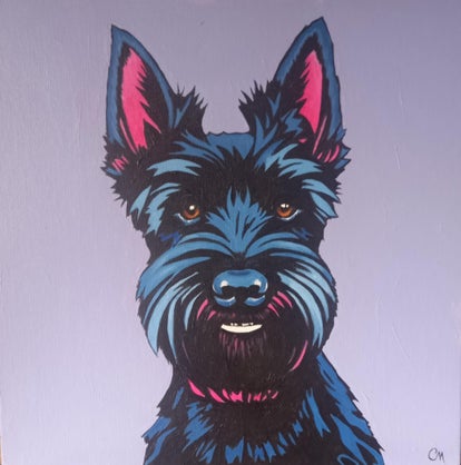 This 12 x 12 inch acrylic painting of a Scottie dog uses bold blacks, pinks, and blues in a pop art style, giving the spirited pup a vibrant, playful energy.On canvas board.