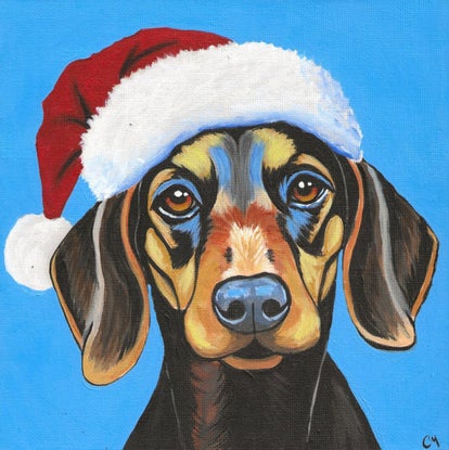 This 8 x 8 inch acrylic painting features a Dachshund wearing a Santa hat against a cool blue background. The piece captures a charming, festive holiday spirit in a compact, vibrant portrait. On canvas board