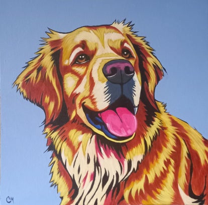 This 12 x 12 inch acrylic painting portrays a Golden Retriever in a pop art style using traditional warm tones. The vibrant, stylized composition brings a playful energy to the classic charm of this beloved breed.On canvas board.